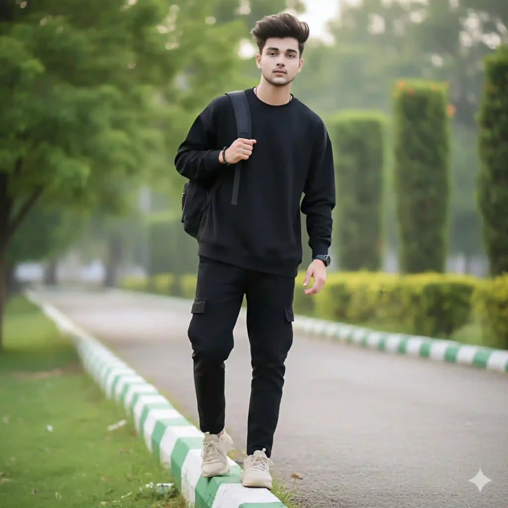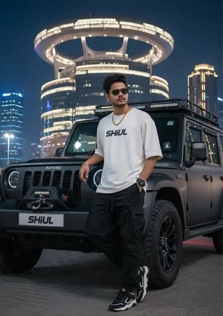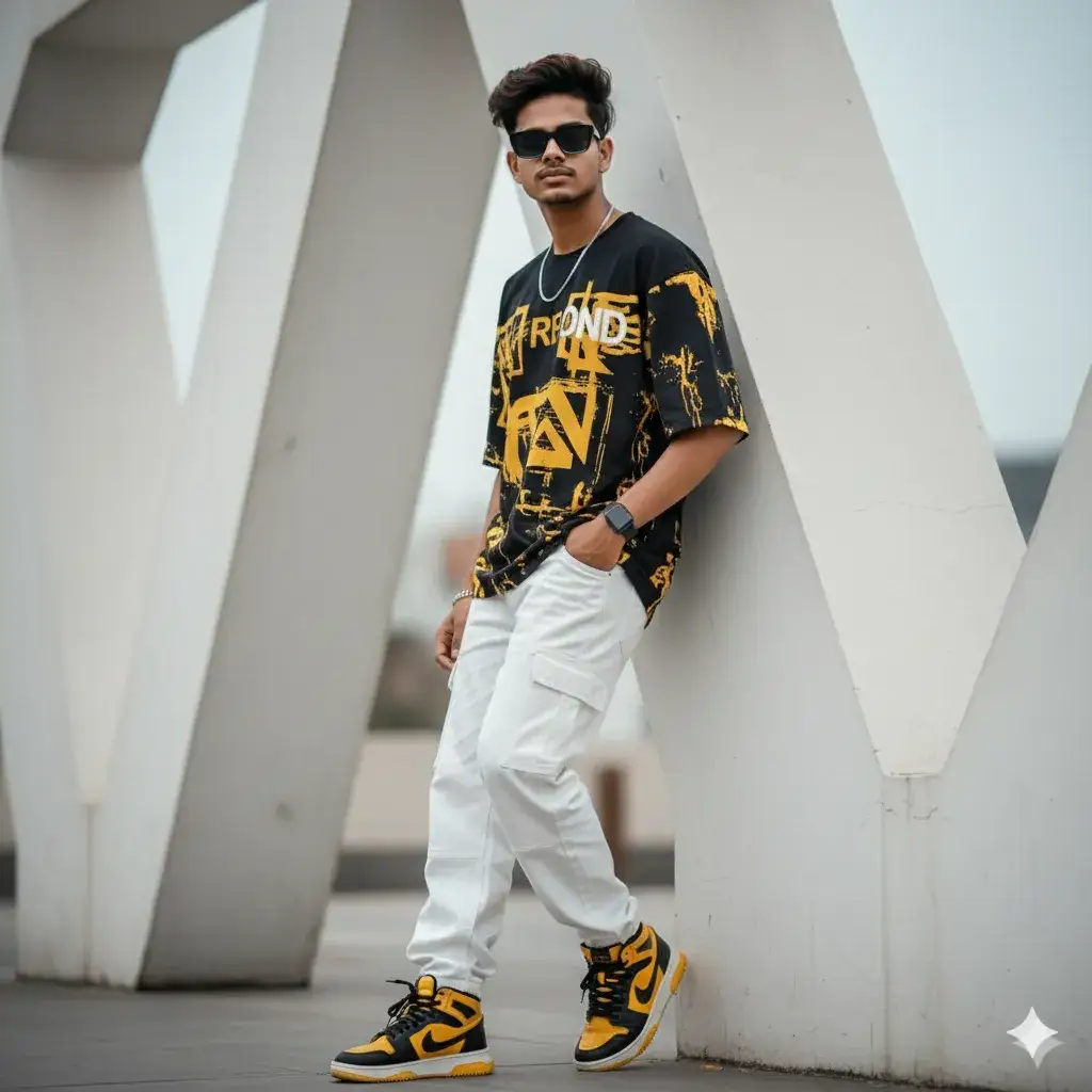 Prompt:-Ultra-realistic,cinematic full-body portrait of Tahir,a stylish young boy (face unchanged from the uploaded image).He leans confidently against a bold white geometric wall structure,he wearing a lose black-yellow branded and stylish T-Shirt,lose white cargo jeans,bracelet,chain,wristwatch,sunglasses,lovely smile,sneakers,his expression calm and assured,face turned slightly toward the camera. His hairstyle is identical to the reference imag.