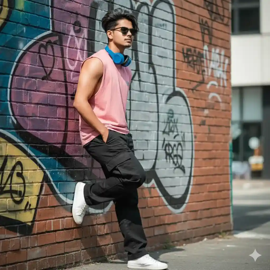 Prompt:-A stylish outdoor portrait of a young man leaning against a graffiti-covered brick wall, wearing a pink sleeveless T-shirt, black cargo pants, and white sneakers. Blue headphones rest around his neck as he gazes confidently into the distance with sunglasses on. Bright natural light enhances the cool, urban street-style vibe.