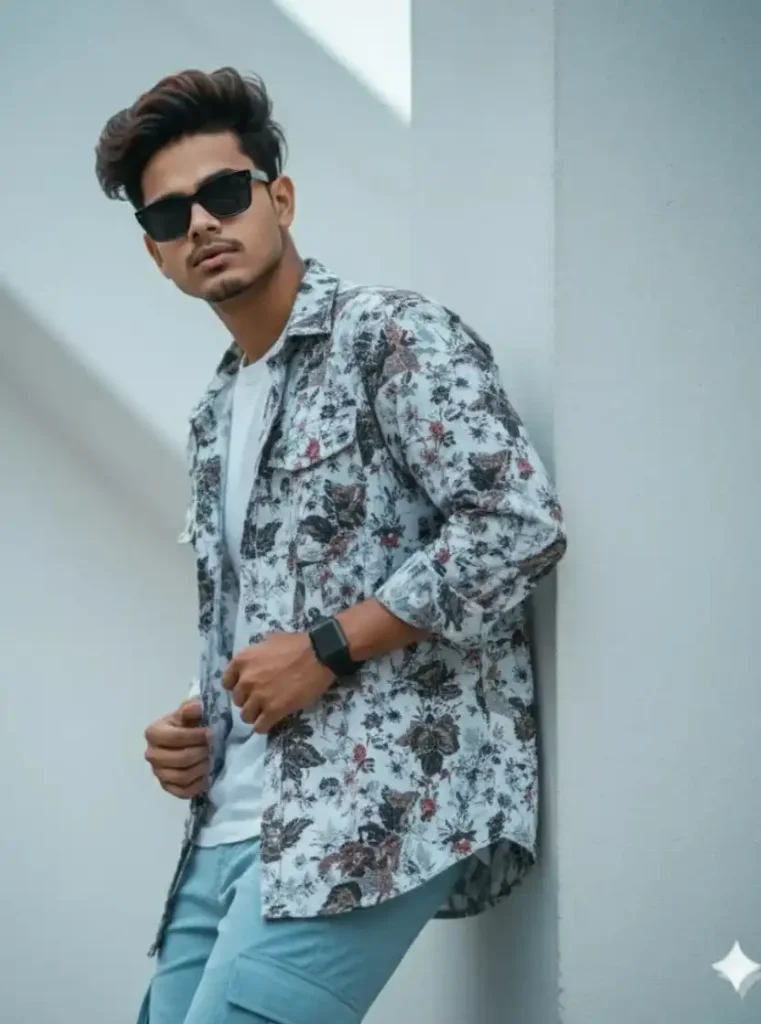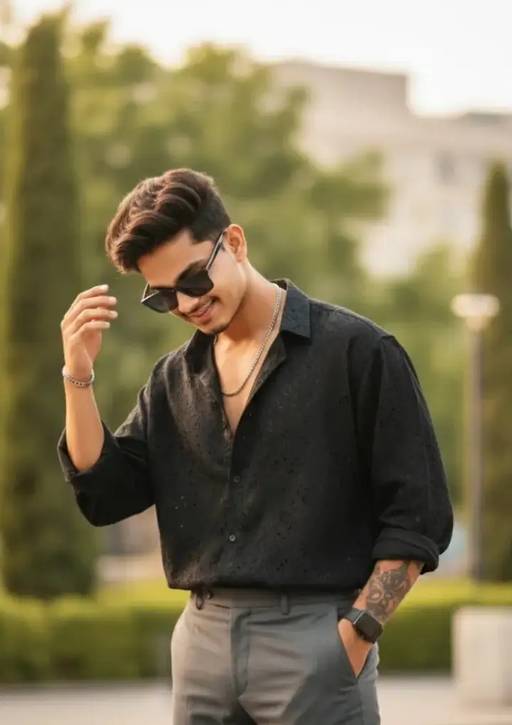 Prompt:-Create image. A 19. years young man(use refrence image) stands outdoors in a relaxed pose, wearing a loose, black pastel-colored Patterned shirt with an open collar and gray Tailored pant. His hand is in his pocket, while the other touches his hair, head tilted down in a candid gesture. He has a stylish watch on his wrist and a simple chain around his neck.The background features blurred greenery and tall trees, giving a soft, natural, urban vibe with daylight and casual fashion.