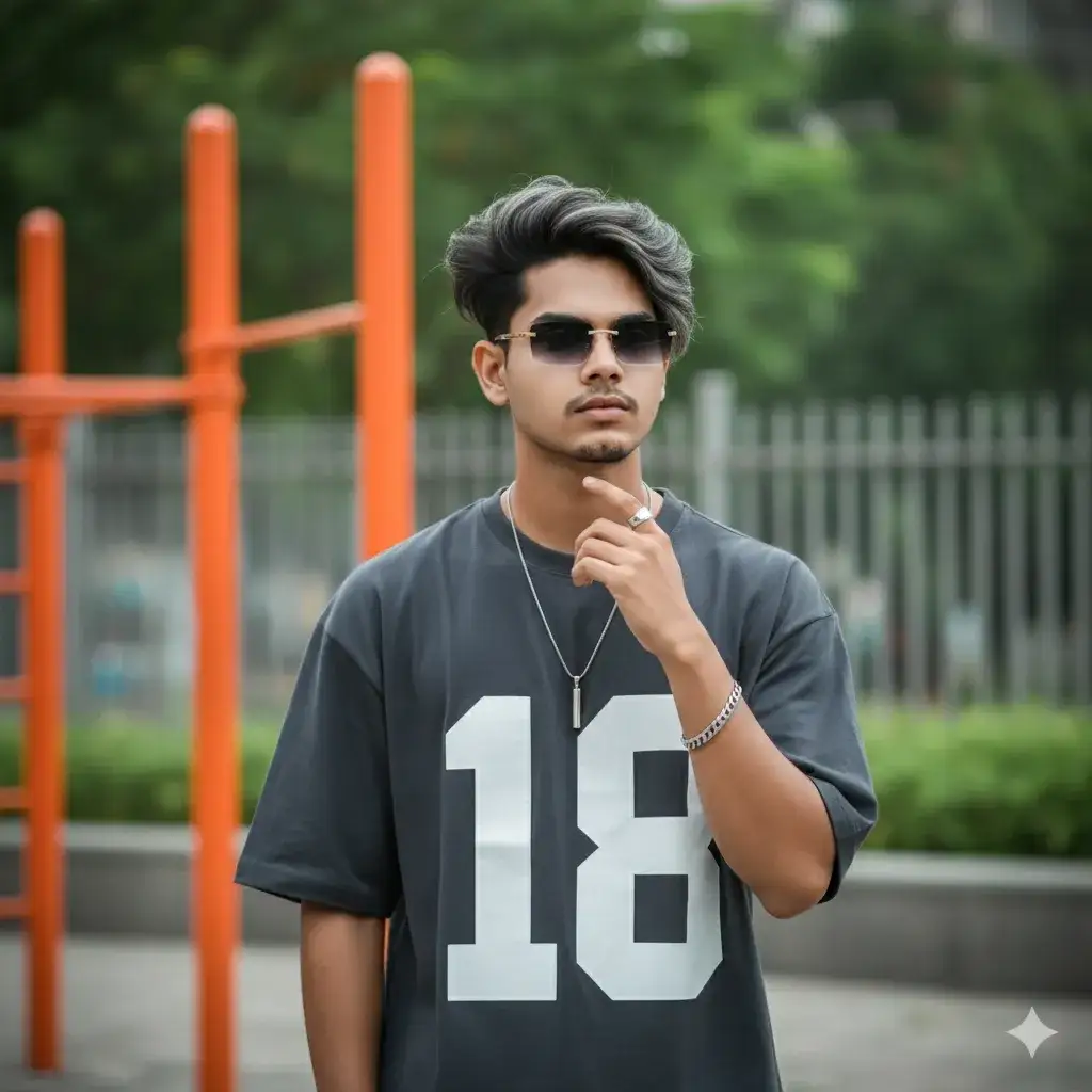 Prompt:-A stylish young man with 100% same face as in refrence is standing outdoors in a casual, modern hair.oversized dark gray t-shirt with a bold white “18” print on the front, a rimless rectangular Gradient black sunglasses golden framing on it, and a cubboid vertical Bar Pendant, A silver bracelet and rings. While one hand near his chin. The background features vertical orange playground bars and a blurred scene with greenery and fencing, giving a modern urban park vibe.