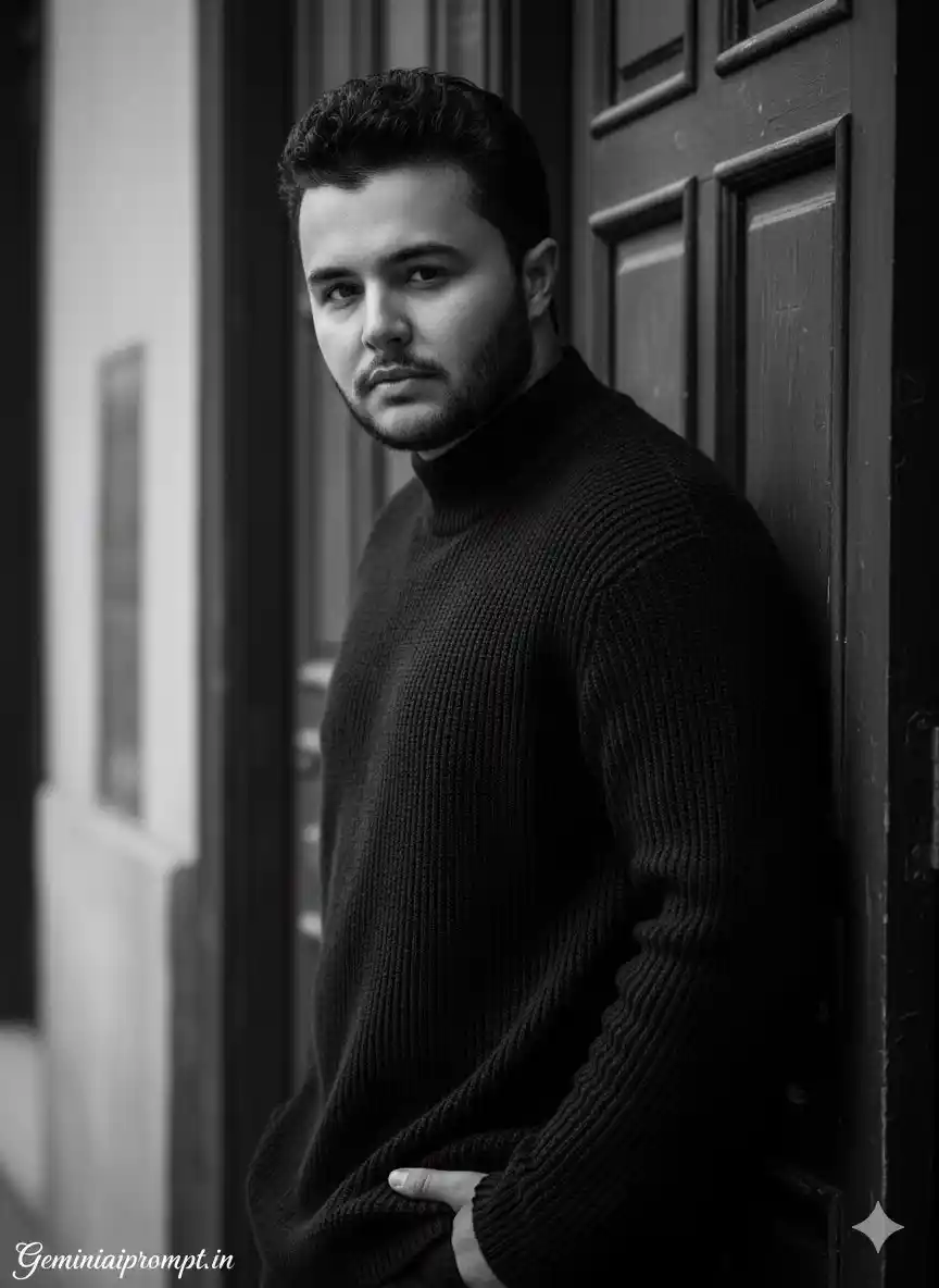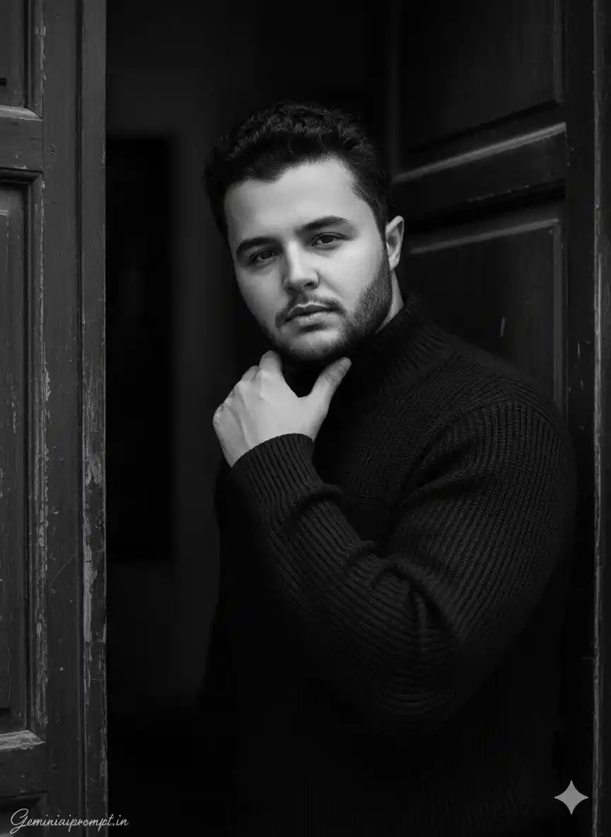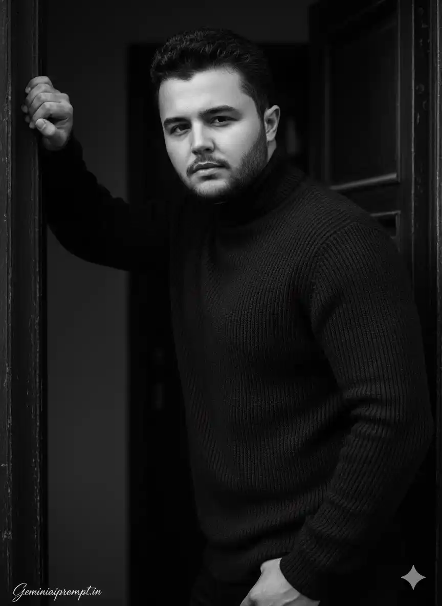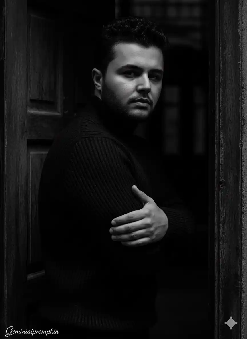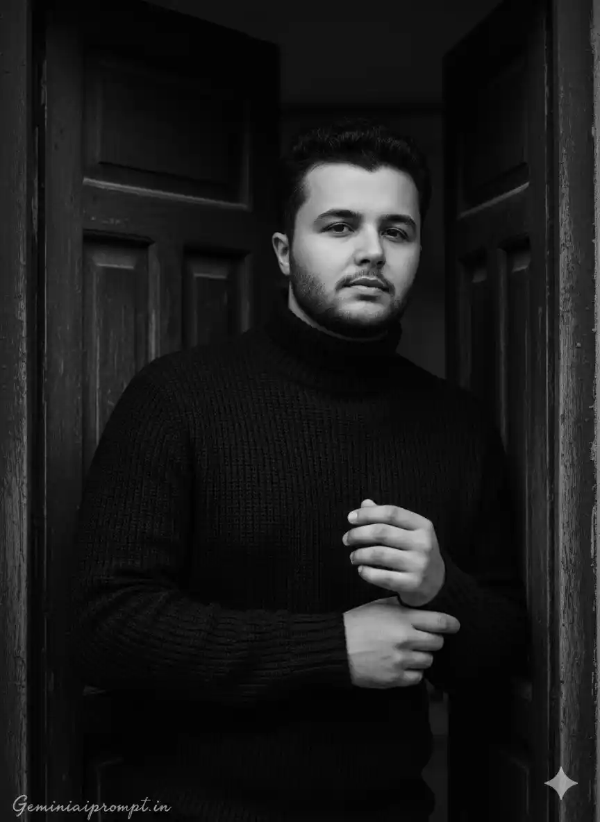 I am captured in a bold, attitude-driven fashion pose, standing confidently within a narrow doorway framed by two dark, aged wooden panels. My posture is assertive and model-like: shoulders squared, chin slightly raised, and my body angled sharply to create strong lines and tension. One arm is bent at the elbow and placed firmly against the door frame at shoulder height, conveying dominance and control, while the other hand rests casually near my hip, relaxed yet intentional.My weight is shifted decisively onto one leg, creating a subtle S-curve in the body, enhancing a modern editorial modeling stance. I am looking directly into the camera with a powerful, composed, and emotionally restrained expression — confident, intense, and slightly enigmatic rather than soft or melancholic.My face must remain EXACTLY identical to my real face from the uploaded reference photo. Do not alter facial structure, skin texture, proportions, expression realism, or identity in any way. Preserve natural skin details, imperfections, and authentic shadows with complete realism.I am wearing a dark, heavy knit sweater with a thick ribbed texture and a structured high neckline. The fit is refined and minimal, slightly relaxed but tailored, with a matte fabric that absorbs light and enhances the moody, fashion-forward aesthetic. No logos, accessories, or patterns.Lighting is natural and directional, entering from one side, creating dramatic chiaroscuro with strong highlights and deep shadows across the face and clothing. The image is black and white, with rich tonal range, high contrast, and a timeless fine-art editorial look.The camera is positioned at eye level, using an 85mm portrait lens, producing shallow depth of field. Focus is razor-sharp on the face and upper torso, while the wooden doorway softly blurs, adding cinematic depth and intimacy.Overall mood is bold, cinematic, stylish, and emotionally controlled — resembling a high-fashion editorial or luxury magazine portrait with a raw yet confident attitude.Add a small, stylish signature text “Geminiaiprompt.in” in the bottom-left corner, minimal and elegant.