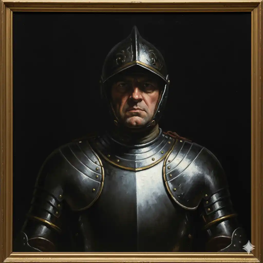 Prompt: A dramatic oil painting portrait of a stern-faced medieval knight or soldier, wearing full polished plate armor and a closed-face helmet that reveals his intense eyes and part of his face. The armor has intricate golden embellishments and metallic sheen, reflecting the dramatic, focused lighting. The background is a solid, deep black, emphasizing the figure and the texture of the armor. The overall impression is one of strength, determination, and historical grandeur, executed in a classical portraiture style.