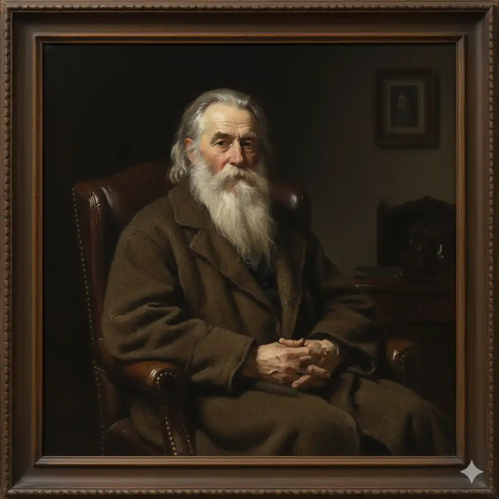 Prompt: A dignified oil painting portrait of an elderly man with a very long, full white beard and grey hair, seated in a dark leather armchair. He is wearing a heavy, dark brown overcoat or robe, with his hands clasped in front of him. His expression is serene and contemplative as he looks towards the viewer. The lighting is soft but dramatic, highlighting his face and the texture of his beard and coat, with a deep, shadowed background that includes a hint of a framed picture and other subtle details, evoking a classical, introspective mood.