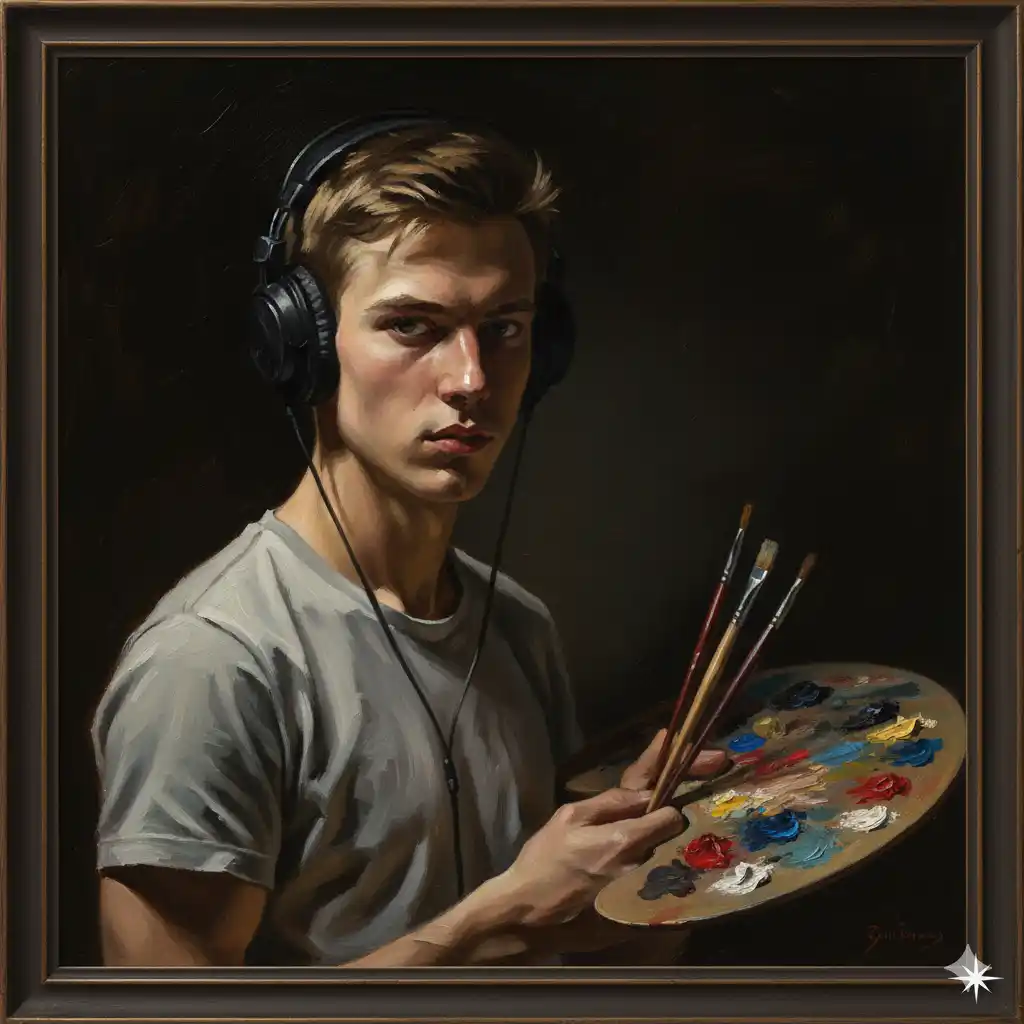Prompt: A contemporary oil painting self-portrait of a young male artist with short, light brown hair, wearing over-ear headphones and a simple grey t-shirt. He holds an artist’s palette with various paint colors and several brushes in his left hand, looking directly at the viewer with an intense, focused expression. The lighting is dramatic, casting strong shadows on one side of his face and highlighting his features against a dark, painterly background, blending classical portraiture techniques with modern elements.