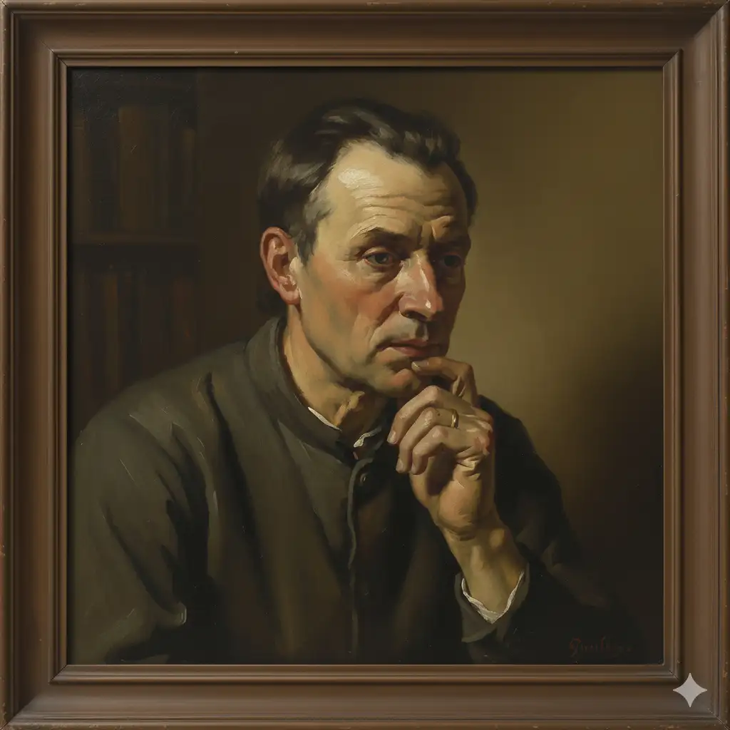 Prompt: A thoughtful oil painting portrait of a middle-aged man with receding dark hair, looking downwards and to the right with a contemplative expression, his hand resting gently on his chin. He is wearing a dark, simple collared garment, possibly a tunic or shirt, with a hint of a white shirt underneath. The lighting is soft and subtle, highlighting the contours of his face and the lines of thought on his brow. In the dimly lit background, a bookshelf with books is subtly visible, suggesting a studious environment. The overall mood is serious and introspective, rendered in a realistic, classical style.