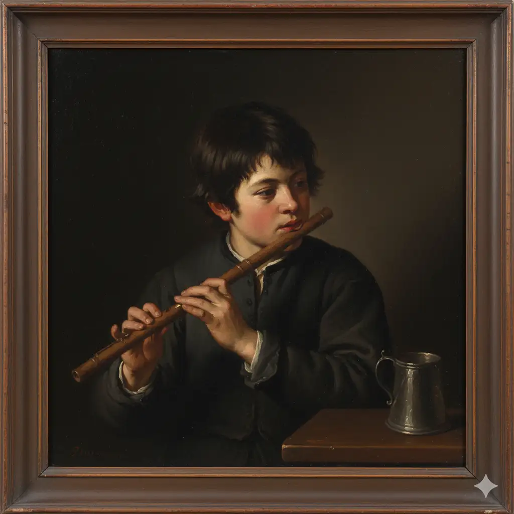 Prompt: A captivating oil painting portrait of a young boy with dark, shaggy hair, deeply engrossed in playing a wooden flute. He is dressed in a dark, simple tunic or jacket. His face is subtly illuminated by a soft, directional light source, highlighting his concentrated expression and the delicate details of his fingers on the flute. A pewter mug is visible on a dark wooden table beside him. The background is dark and subdued, allowing the figure and the musical instrument to be the central focus, typical of a classical Dutch Golden Age painting.