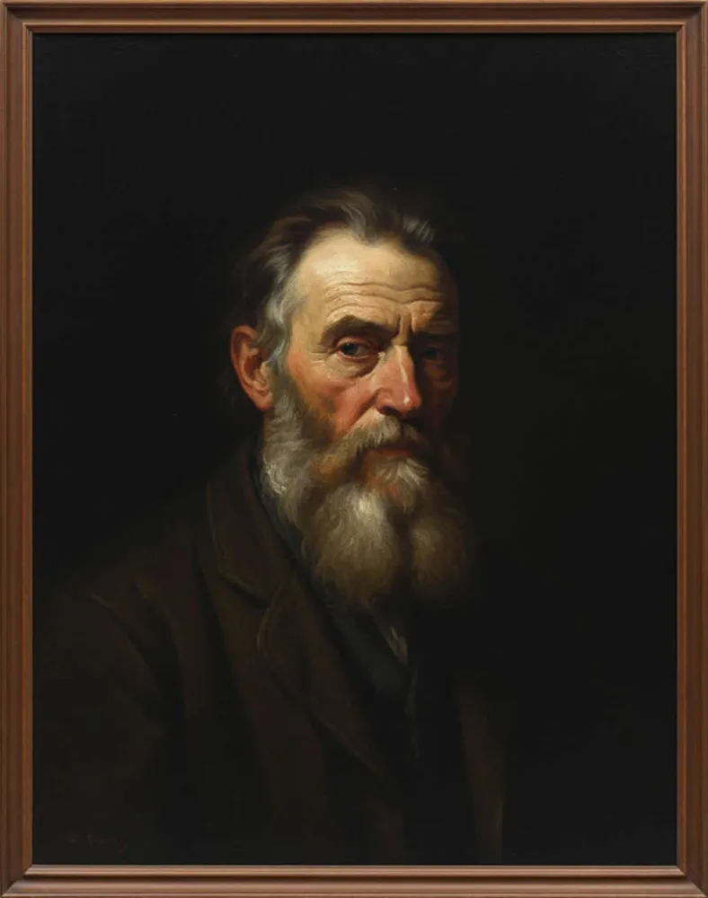 Prompt: A striking oil painting portrait of an elderly man with a prominent, full white beard and grey hair, looking directly forward with a serious, weathered expression. He is wearing a dark brown jacket or coat, which fades into the deep, dark, and featureless background. The lighting is intensely dramatic and chiaroscuro-style, with a strong single light source illuminating his face and beard from the front, creating stark contrasts and deep shadows, reminiscent of a Rembrandt masterpiece, emphasizing the texture of his skin and the gravitas of his gaze.