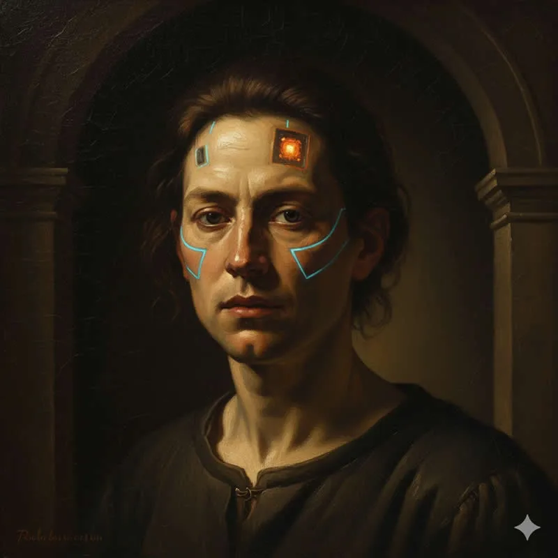 Prompt: A captivating oil painting portrait blending classical Renaissance style with futuristic cyborg elements. It features a young man with dark, shoulder-length hair, looking directly at the viewer with a neutral expression. His face is adorned with subtle, glowing blue geometric lines and embedded cybernetic components, including a prominent, glowing orange square on his forehead. He is wearing a dark, simple tunic that merges with the deep, shadowed background, which hints at architectural elements like an archway. The lighting is soft yet focused, reminiscent of classical portraiture, highlighting the realistic skin texture and the luminous futuristic implants, creating a striking contrast between old and new.