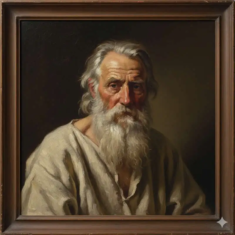 Prompt: A close-up oil painting portrait of an elderly man with a long, flowing white beard and grey hair, looking directly at the viewer with a thoughtful expression. He is wearing a simple, light-colored tunic that drapes loosely. The lighting is dramatic, with a strong light source highlighting his face and beard against a dark, Rembrandt-style background. The brushstrokes are visible, adding to the classical artistic feel, capturing the texture of his skin and the softness of his beard.