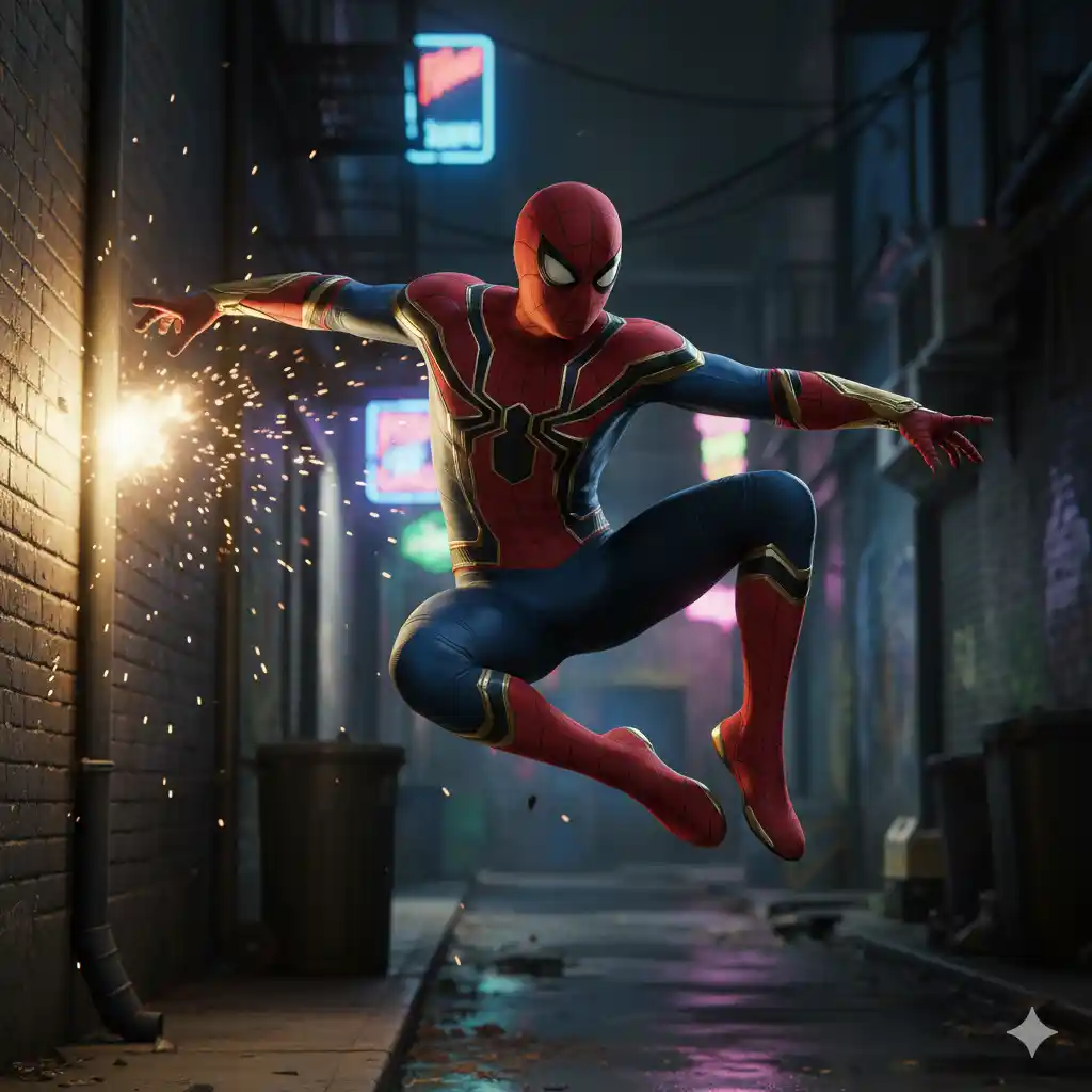 “A dynamic, action-shot of Spider-Man in mid-air, leaping or swinging through a narrow, dark alleyway at night. His suit is the advanced red, blue, and gold Iron Spider design, with metallic accents and detailed web patterns. Sparks and debris are flying around him, suggesting recent action or an explosion. The background features dimly lit brick walls, neon signs, and grunge elements. The lighting is dramatic and cinematic, emphasizing his movement and the chaos around him. His pose is agile and powerful, with a focus on capturing the energy of the scene. The image should convey a sense of speed and excitement, with high attention to detail on the suit and environment.”