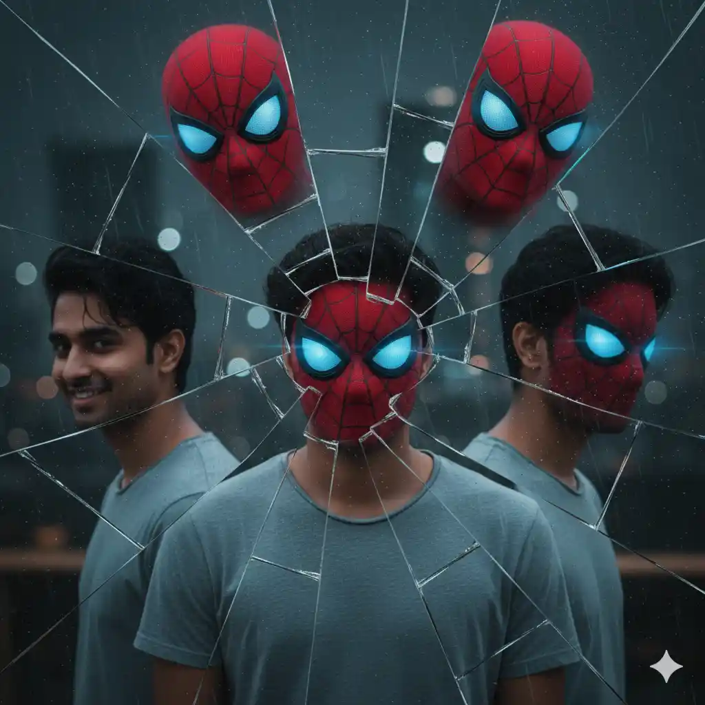 “A surreal and conceptual image depicting a young Indian man with multiple reflections or fragmented versions of himself, all seen through shattered glass. In the center, the man wears a grey t-shirt, and parts of a Spider-Man mask with glowing blue eyes are superimposed on his face, creating a hybrid look. To his left, a reflection shows him smiling naturally in a grey t-shirt. To his right, another reflection shows him with a similar partial Spider-Man mask and blue glowing eyes, looking slightly more serious. Above, two fragmented reflections of the full Spider-Man mask are visible. The background is dark and moody, possibly raining, suggesting introspection or a broken reality. The overall effect should be dramatic and thought-provoking, playing with themes of identity and duality, with intricate broken glass patterns overlaying the scene.”
