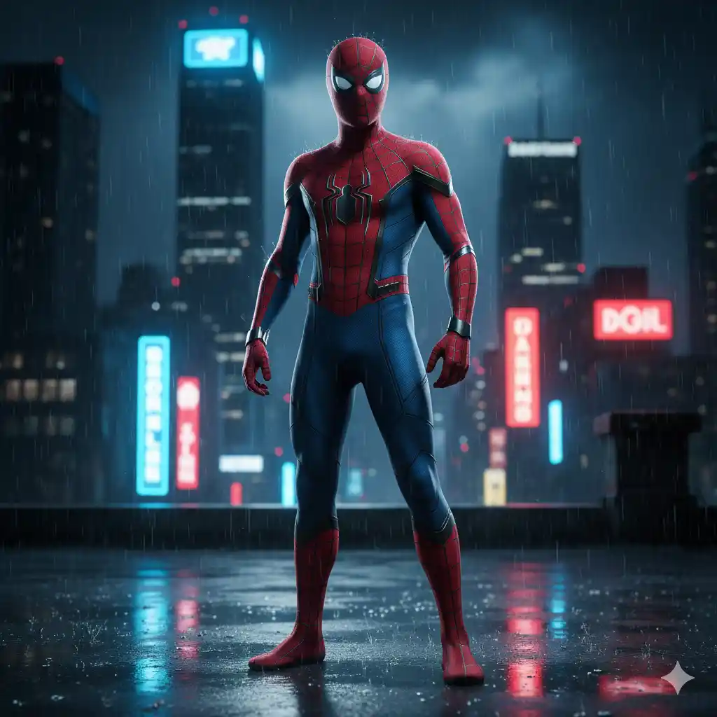 “A full-body shot of Spider-Man standing on a wet rooftop at night, with a cityscape of glowing neon lights and skyscrapers in the background. The rain is falling, creating reflections on the ground. Spider-Man’s suit is the classic red and blue, with intricate web patterns and a sleek, modern design. The lighting is dramatic, highlighting the textures of his suit and the wet surfaces. The pose is confident and heroic, with a slight contrapposto stance. The image should capture the iconic look of Spider-Man, with a focus on realism and detailed textures.”