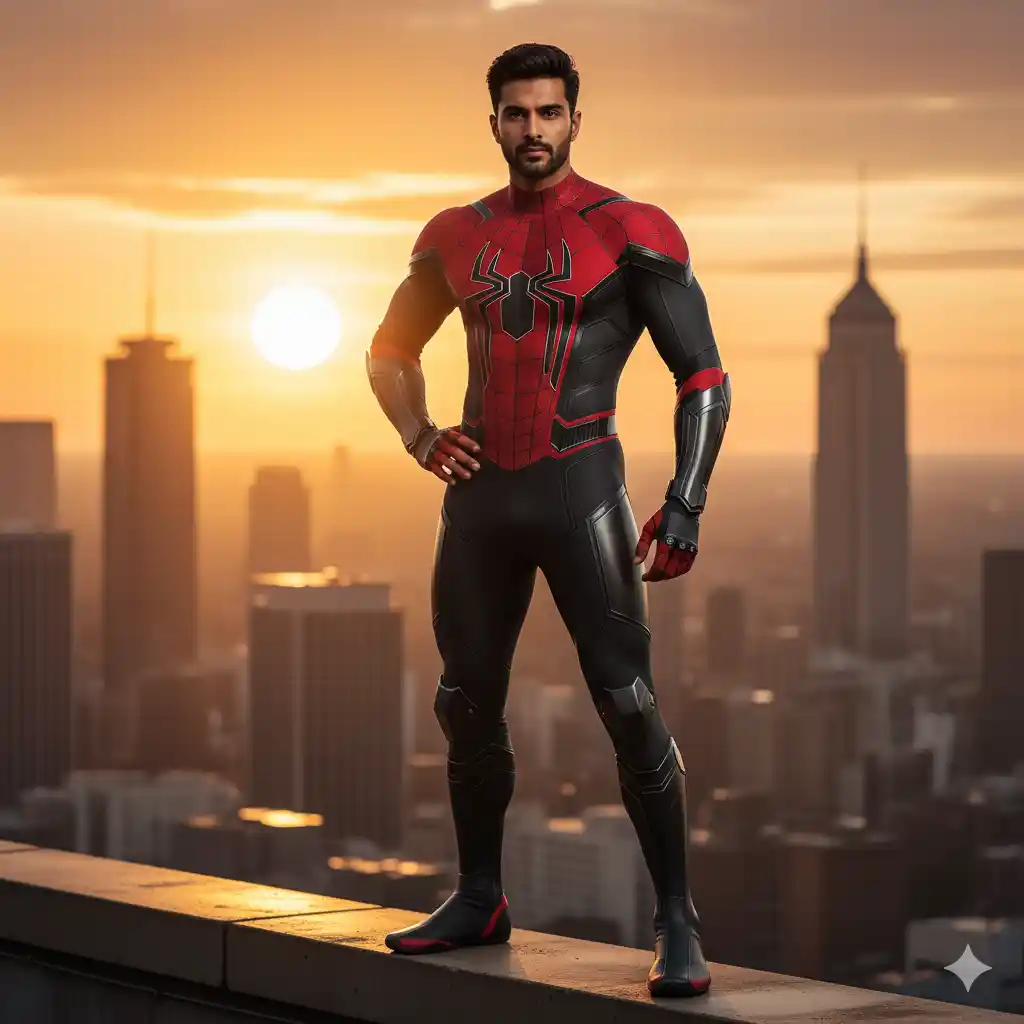 “A full-body shot of a handsome Indian man with a beard, wearing a sophisticated red and black Spider-Man suit, standing confidently on a rooftop edge. The suit has intricate web patterns and metallic accents, resembling a more tactical or advanced version. He has one hand on his hip, looking directly at the viewer. The background features a sprawling cityscape at sunset, with a large, warm sun setting on the horizon, casting a golden glow over the scene. The lighting is dramatic and warm, highlighting the textures of his suit and the urban environment. The pose is heroic and strong, capturing a commanding presence.”