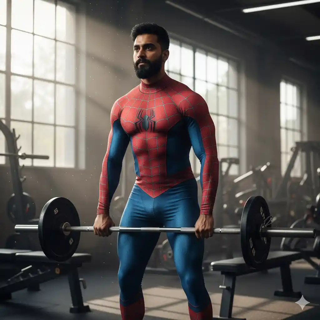 “A powerful, full-body shot of a muscular Indian man with a beard, wearing a tight, red and blue Spider-Man themed workout suit with a high collar and subtle web patterns. He is in a gym, lifting a barbell with weights, in the middle of a deadlift or squat. The gym is industrial-looking with large windows in the background, allowing natural light to stream in, creating dramatic light rays and dust particles. Other gym equipment, like benches and racks, is visible in the background. The lighting is strong and focused, highlighting his effort and the definition of his muscles. The pose is athletic and determined, capturing a moment of intense physical exertion.”