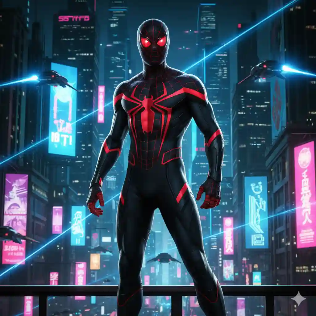 “A futuristic, full-body shot of Spider-Man in a sleek, black suit with glowing red neon accents and a prominent red spider emblem on his chest. His eyes also glow red. He is standing on a balcony or ledge overlooking a vibrant, cyberpunk cityscape at night, with towering skyscrapers, holographic advertisements, and flying vehicles in the background. Blue energy lines or light trails are crisscrossing the scene. The lighting is dramatic, emphasizing the glow of his suit and the neon lights of the city. The pose is powerful and commanding, conveying a sense of advanced technology and stealth. The image should have a strong sci-fi aesthetic with high detail on the suit’s intricate patterns.”