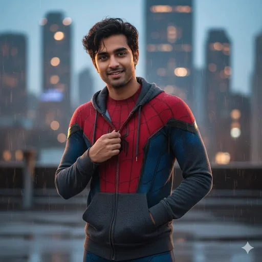 “A medium shot of a young, smiling Indian man, with dark wavy hair, wearing an open grey and blue hoodie over a partially visible Spider-Man suit. He is standing on a rainy rooftop with blurred city skyscrapers in the background during dusk or night. One hand is adjusting the zipper of his hoodie, and the other is casually in his pocket. The lighting is soft and atmospheric, highlighting his friendly expression and the subtle wetness of the environment. The image should capture a natural, approachable, and slightly relaxed superhero vibe.”